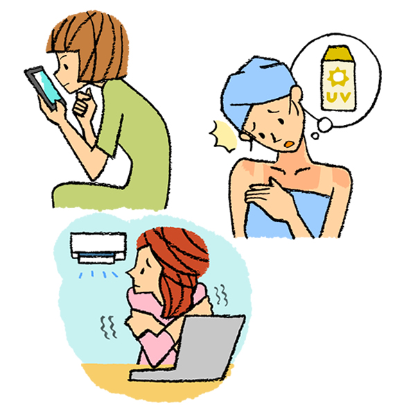 肌の乾燥はシワやシミを引き起こす原因になります。エアコンによる乾燥は冬のイメージですが、夏の冷房でも空気は乾燥します。また、日焼けによっても肌が乾燥しやすくなります。